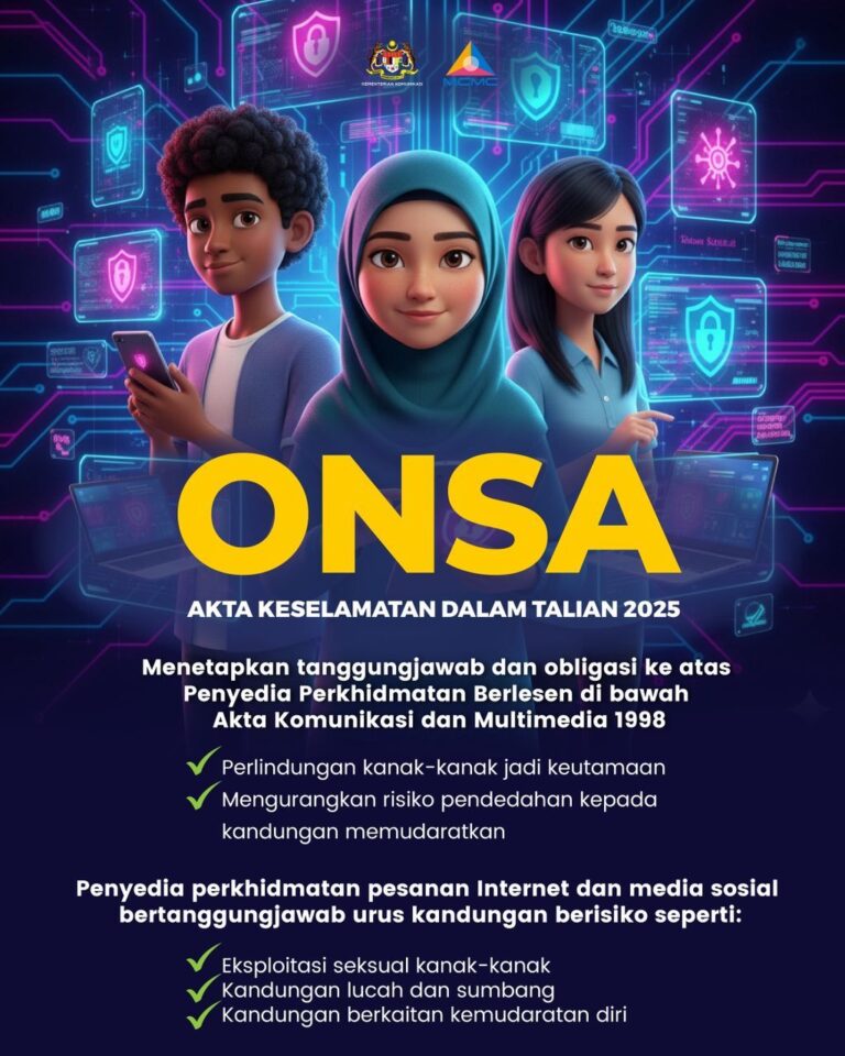 Akta Keselamatan Dalam Talian 2025 (ONSA) memperkukuh tanggungjawab platform digital demi keselamatan pengguna. Perlindungan kanak-kanak diutamakan, kandungan memudaratkan wajib ditangani. Keselamatan dalam talian bukan pilihan, ia tanggungjawab bersama. Maklumat lanjut mengenai ONSA boleh didapati di laman sesawang MCMC dihttps://mcmc.gov.my/en/onsa/home #MCMC#NADIMCMC#ONSA