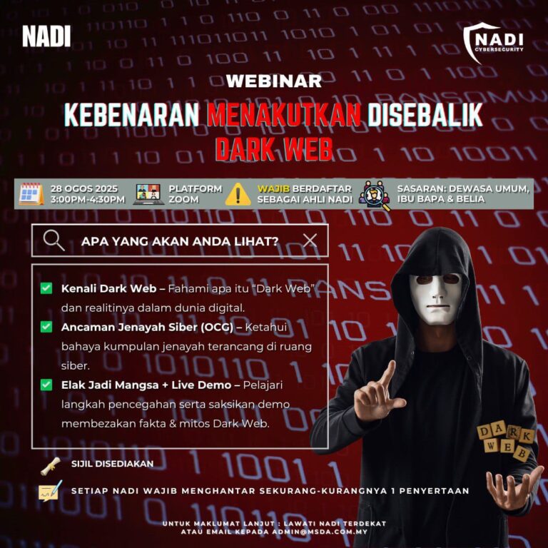 📅 28 Ogos 2025 (Khamis)🕒 3:00 PM – 4:30 PM💻 Platform: Zoom🔗 Pautan Pendaftaran: cybersecurity.nadi.my (untuk ahli NADI sahaja) 📌 Apa yang akan dipelajari?✅ Kenali Dark Web – Fahami apa itu “Dark Web” dan realitinya dalam dunia digital.✅ Ancaman Jenayah […]