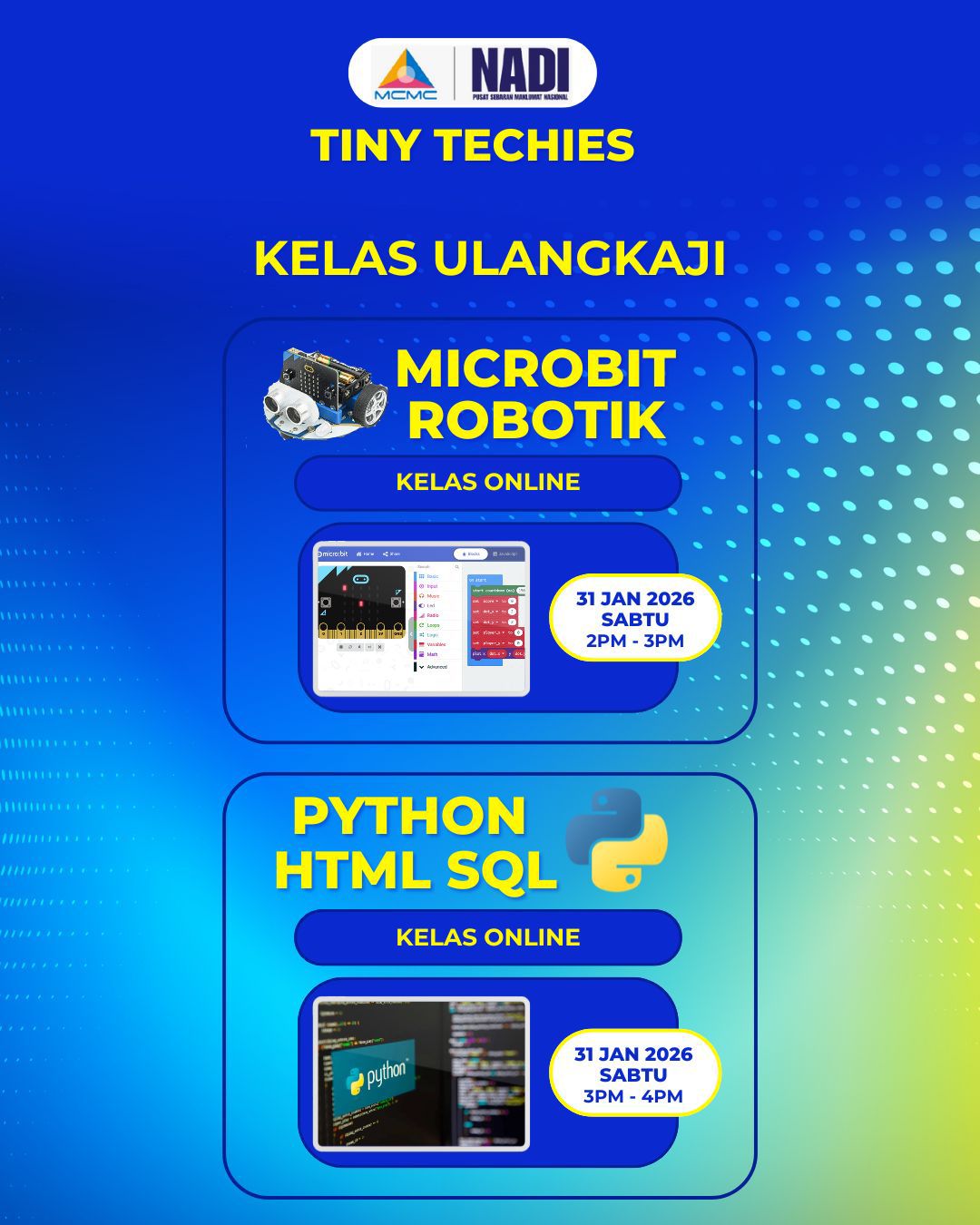 Assalamualaikum dan Salam Sejahtera, Dimaklumkan bahawa program TINY TECHIES – Kelas Ulangkaji (Atas Talian) akan dianjurkan khas untuk murid Sekolah Rendah dan Sekolah Menengah seperti ketetapan berikut: TINY TECHIESKELAS ULANGKAJI (ATAS TALIAN)Program pembelajaran teknologi untuk murid Sekolah Rendah dan Sekolah […]