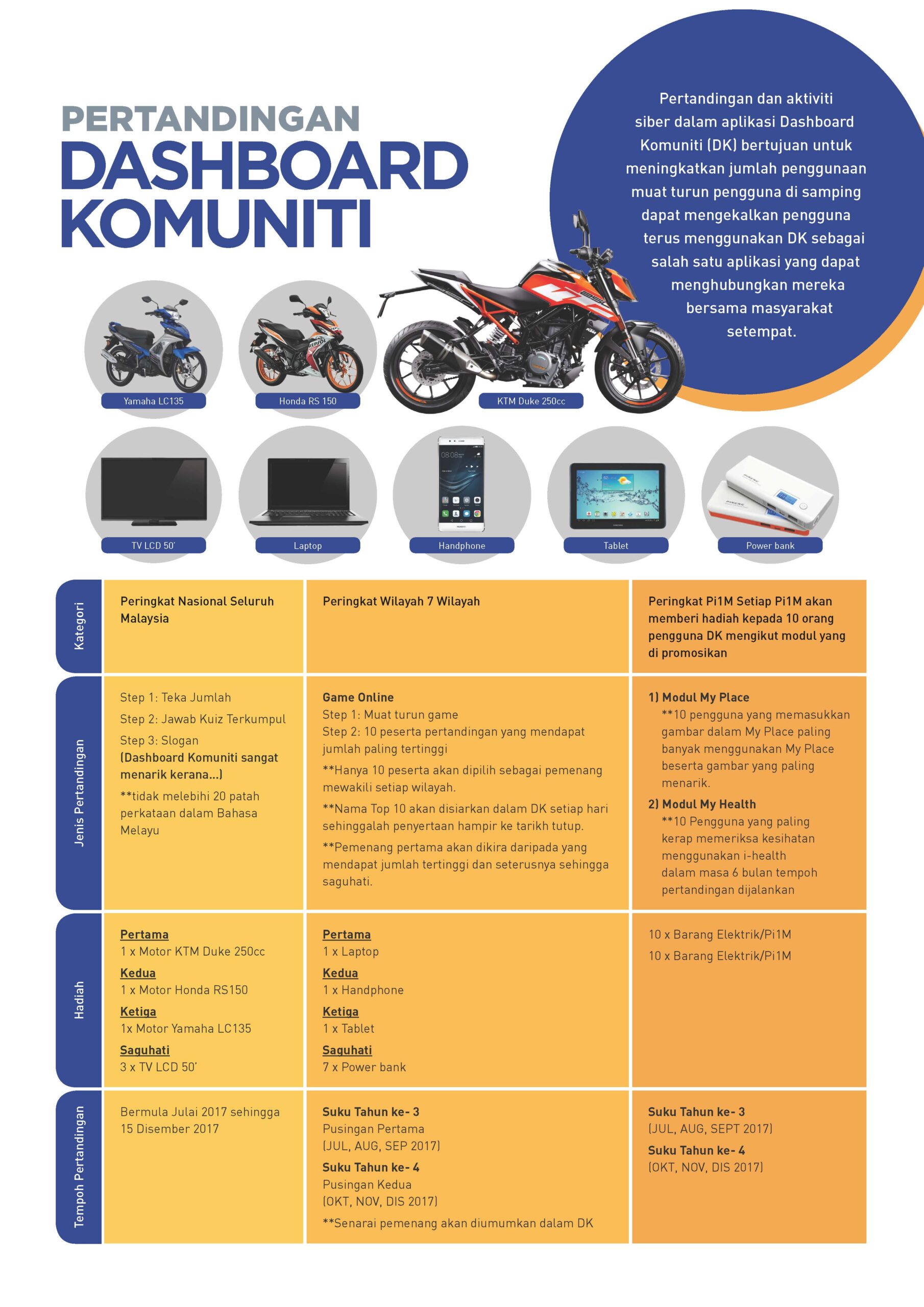 *Senarai Kategori dan hadiah pertandingan Dashboard Komuniti 2017. Pertandingan Dashboard Komuniti (DK) akan bermula pada bulan Julai 2017 dan berakhir pada 15 Disember 2017.Beberapa Kategori yang akan dipertandingkan. Antaranya ialah ; 1)Peringkat Nasional (1Malaysia) 2)Peringkat Wilayah 3)Peringkat Pi1M […]